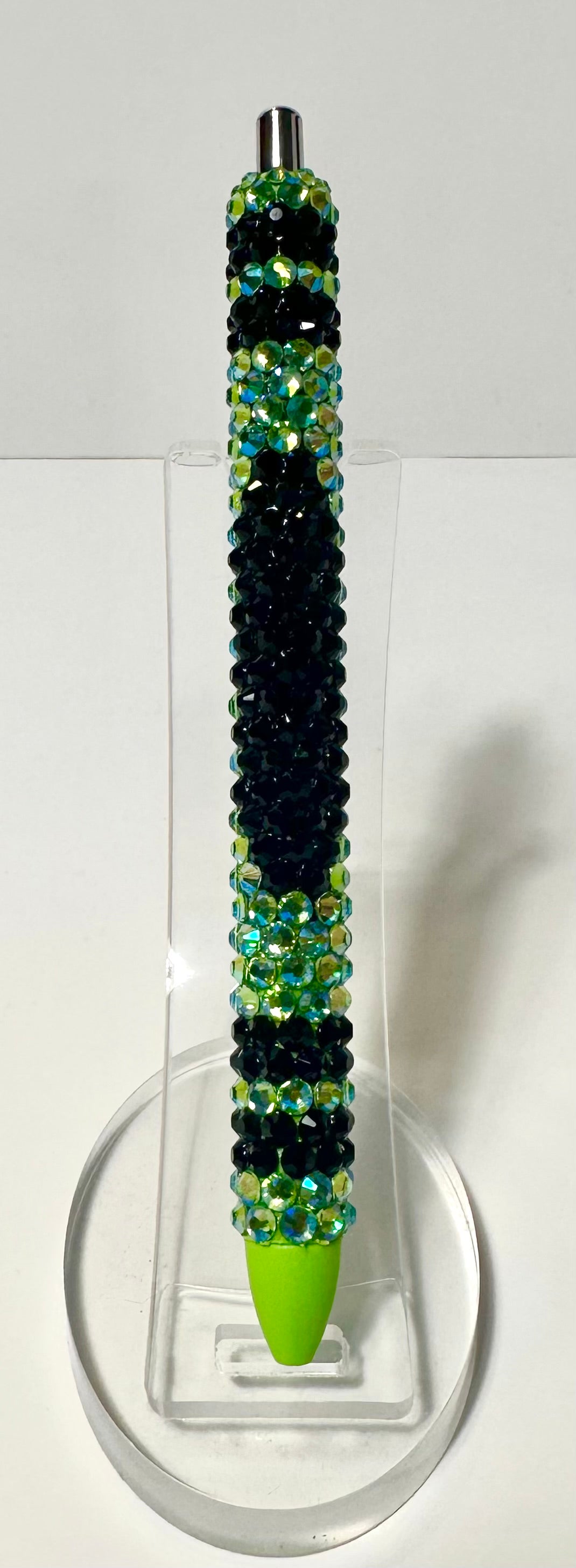 Crayon, rhinestone pen collection, 7 mm ink joy said comes in Sky blue, pink, light green, fuchsia and white.{ White only writes on black paper} and Turquoise. The color of the ink is the bottom tip of the pen that you see.