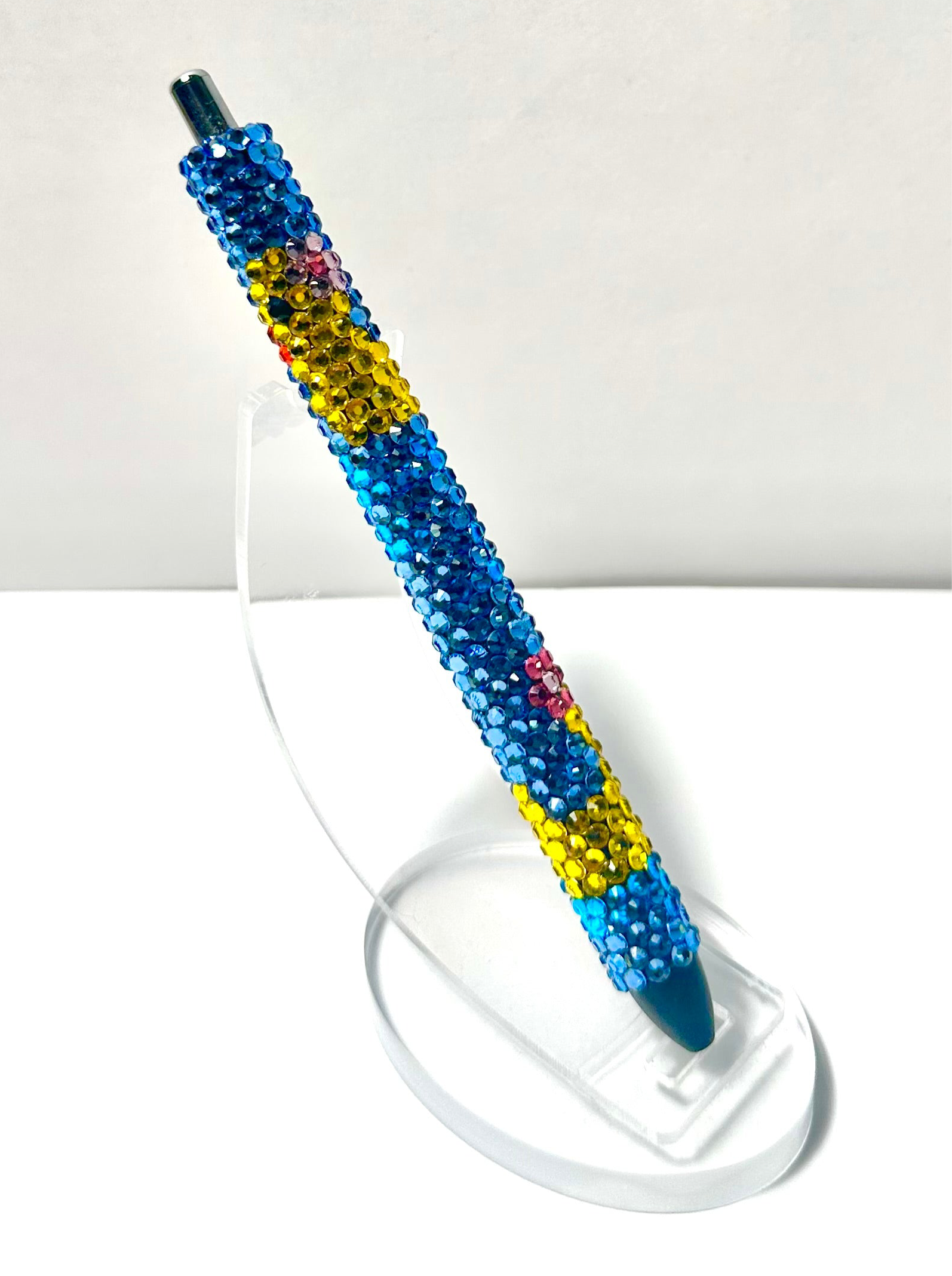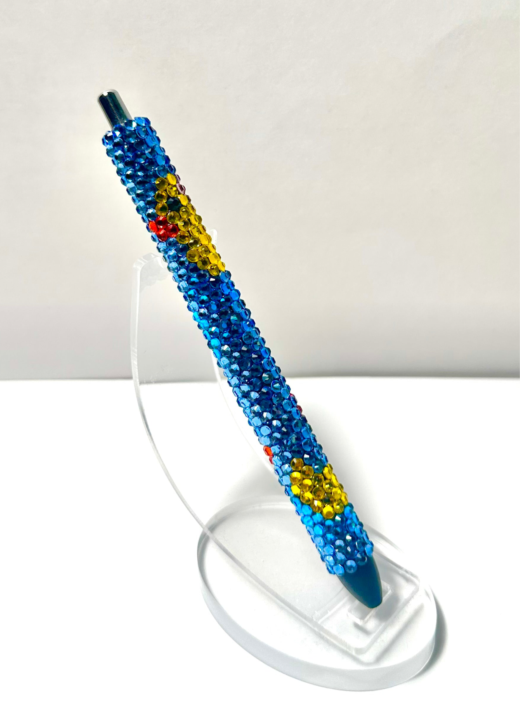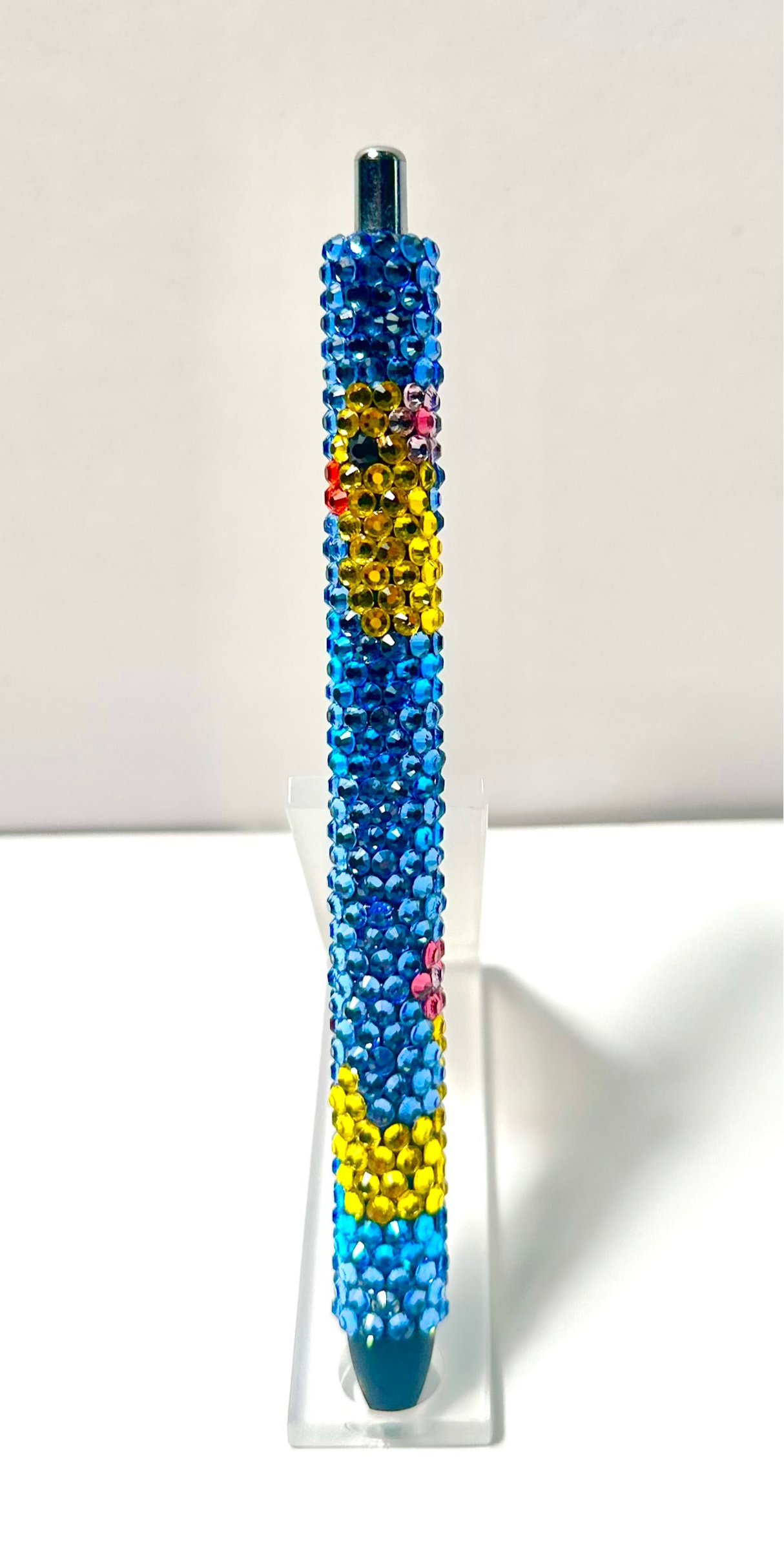 Personally Designed hand rhinestone by yours truly ducky design with a blue water background on a black joy pen writes in black ink 0.7 mm