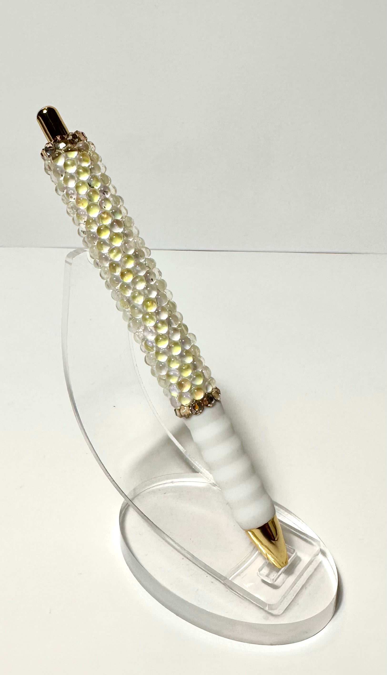 Frosted Gold Pens with Black Ink.gold rhinestones at the top and bottom . the rest are mermaid stones.