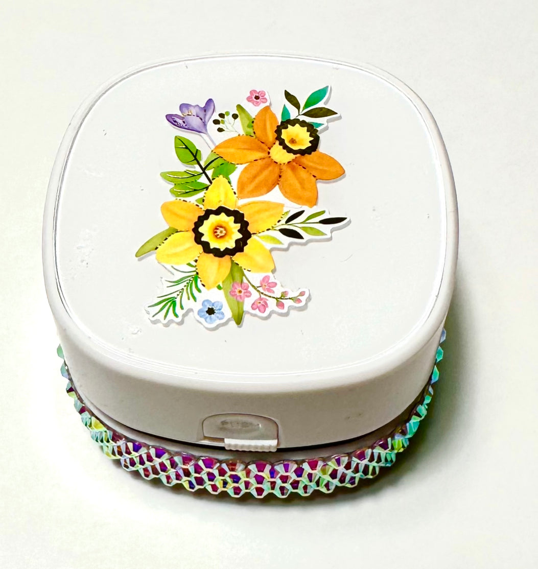 Mini desk vacuum with AB rhinestones. You can Choose what decal you want as long as I can get it, you can have it.As long as I can make it, you can have it. I personally have been using this vacuum for three years now and it is absolutely amazing. I love using it on my desk to clean up the desk to clean up the little debris when I’m doing crafts and just to clean up my Mats on my desks.